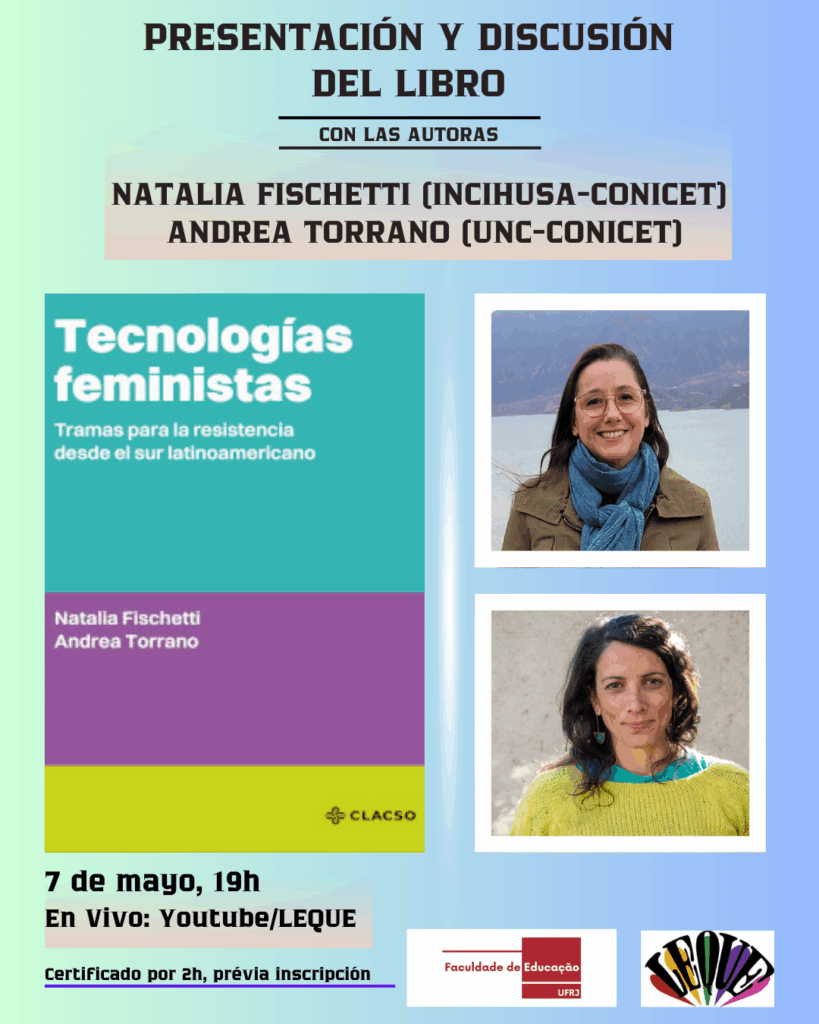 El 7 de mayo, a las 19 horas (Brasil), tendremos el honor de recibir a Natalia Fischetti y Andrea Torrano para una conversación sobre el libro “Tecnologías feministas: tramas para la resistencia desde el sur latinoamericano”, publicado en 2024 por Clacso y de libre acceso a través del sitio web de la editorial.